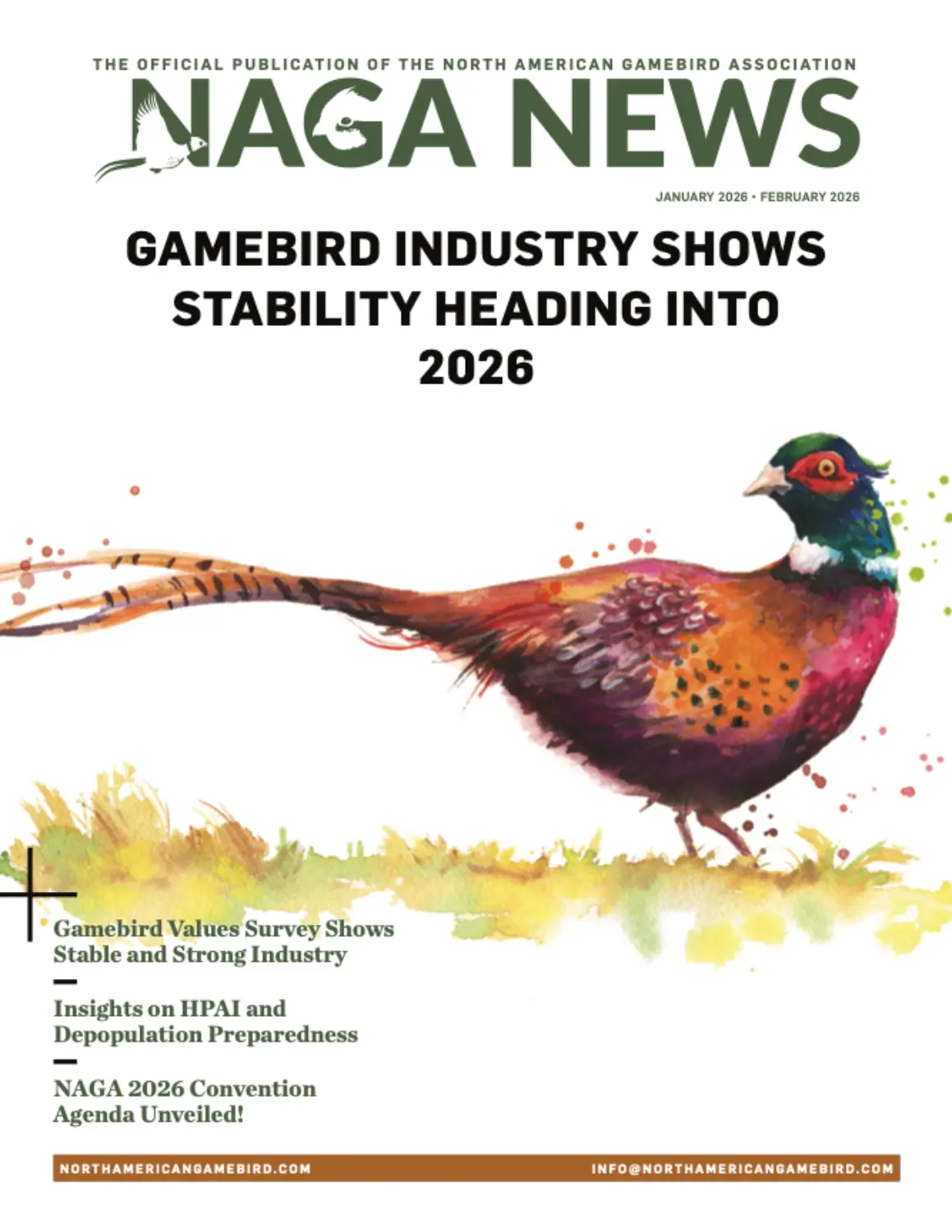 The NAGA News magazine is complementary with your NAGA membership. This bi-monthly publication offers timely articles relevant to businesses in the game bird and hunting preserve/ shooting industries. Stay abreast to what is going on with animal health, farming, the hunting industry, and legislation affecting game bird producers and hunting preserve operators. It’s also a great way to stay in touch with your fellow NAGA members. For more information, contact NAGA Communications Director, Britney Booth at editor@northamericangamebird.com.
